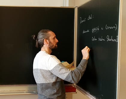 Pak jim dám čas, aby si udělali poznámky, k tomu jim na tabuli předem připravím základní záchytné body, data a termíny. Jejich úkolem je to spojit s tím, co slyšeli a viděli a udělat si vlastní zápis do sešitu. Občas mají napsat i krátkou úvahu ve souvislosti s probíraným tématem, nebo s větším úsekem z epochy.