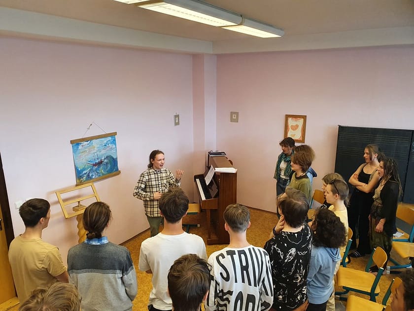 Dvacetiminutovým rozezpíváním vestoje se zahajuje každá dvouhodinovka předmětu sborový zpěv, který na pražském waldorfském lyceu mají v prvním, druhém i třetím ročníku – tam do pololetí. Je úterý odpoledne. Což znamená, že druháci se na sbor musejí vracet po obědě, s plným žaludkem, hodina začíná ve 14.20 a končí těsně před čtvrtou. To není moc příjemné ani těm žákům, kteří předmět mají rádi, zvlášť když je venku hezky. Sborový zpěv je ale na lyceu povinná součást hudební výchovy, nikoli jen pro ty, kteří rádi zpívají. „Nakonec ale u většiny myslím převáží, že to někam vede, líbí se jim, co vzniká. Takže i když trochu remcají, smysl v tom vidí,“ říká Josefína Poláková, jedna z patnácti přítomných dívek. Kluků je dvanáct.