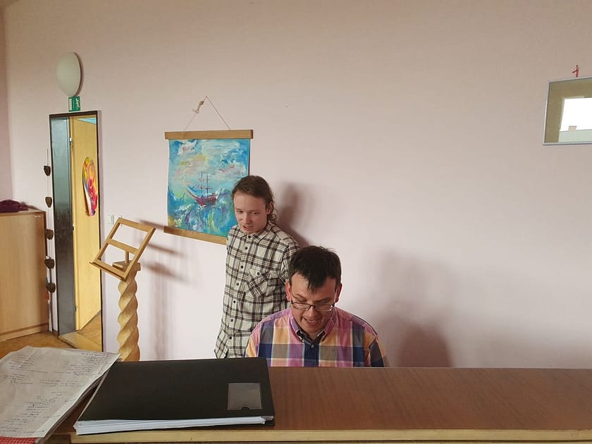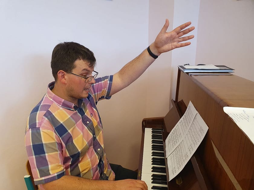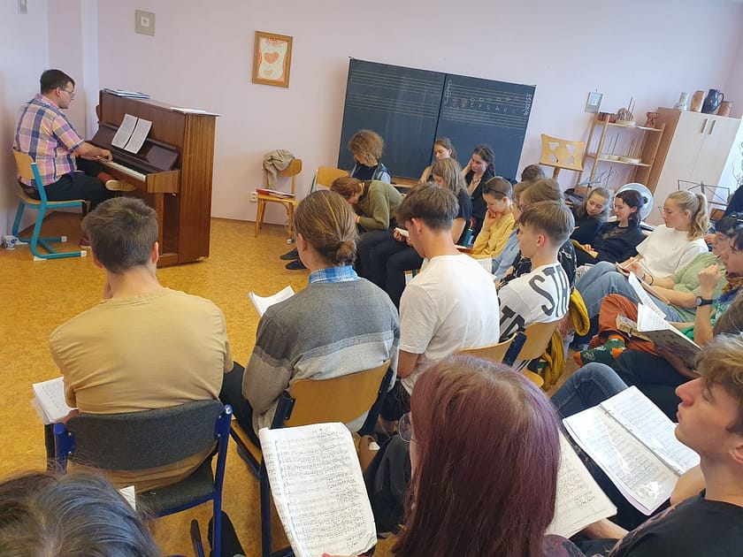 Na budoucí koncert, kterým předmět kulminuje, tato třída nacvičuje Glagolskou mši od Janáčkova současníka Josefa Bohuslava Foerstera a Ecce sacerdos magnus od Antona Brucknera. „Je to pompézní a slavnostní skladba pro sbor, varhany a tři pozouny, někdy nakládačka. A vybrali jsme ji i proto, že jeden chlapec hrál na pozoun, pak přestal a my učitelé jsme chtěli, aby zase začal hrát. Další dva pozouny si budeme půjčovat ze ZUŠ Lounských, pomohla nám je najít paní hospodářka, její synek taky hraje na pozoun,“ říká Ondřej Ševčík.