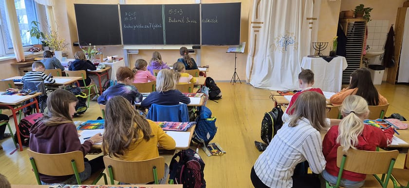 „Minulá epocha matematiky byla zaměřená na míry a váhy a byla hodně praktická,“ vysvětluje mi učitelka po hodině, jak ještě může vypadat výuka. „Děti v tomhle věku jsou šťastné, když se něco opravdu dělá. Tak jsme jeli do Prahy, děti byly rozdělené do skupinek a pozorovaly, kolik hodin po cestě viděly. Někdo sledoval, někdo zapisoval,“ pro lepší představu. „Včera jsme zase hráli celotřídní hru a taky jsme oslavovali ty, kteří zvládly dokončit nějakou z násobkových řad. Newaldorfsky jsem přinesla čokoládu, ale i při jejím rozdělování jsme počítali,“ směje se.