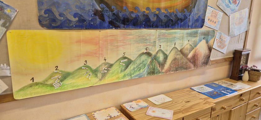 Vzadu ve třídě, nad podlouhlou skříňkou, visí obraz s horami. Nalevo jsou to malé kopce, pak se zvyšují, až jsou to velehory. Každá hora odpovídá násobkové řadě. U dvojkové řady – což je malý kopec – je nalepeno nejvíc lístečků se jmény dětí, ale tři žáci jsou už u vysoké hory – šestky.