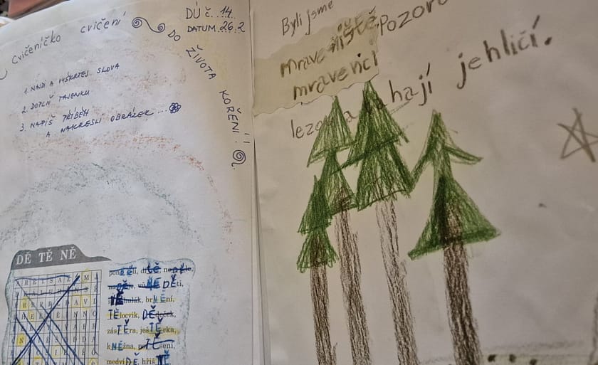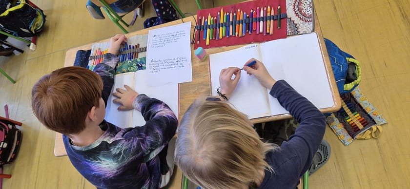 Krátkou přestávku využiji na to, že se s Janou Vyskočilovou, která si připravuje následující hodinu, dívám do písanek. „Procvičujeme „dě-tě-ně a bě-pě- vě“, co jsme se učili už loni. Máme na to křížovky a když jim vyjde tajenka, mají pak napsat krátký příběh, který se váže k danému slovu,“ říká mi. V tomto případě byla tajenka stůl „Některé děti rády píšou, jiné zase dělají krásné obrázky,“ ukazuje mi sešity dětí učitelka plné barevných věcí. Děti v prvních ročnících waldorfské školy píší pastelkami.