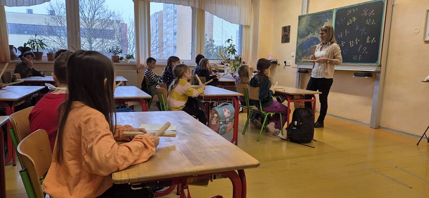 Teď si děti rozdají dřevěné paličky, paní učitelka čeká, až se třída zklidní, a začne těmi svými klepat o sebe do rytmu: ta tata ta ta ta ta ta. Děti to po ní opakují. Paní učitelka rytmus několikrát změní s pobídkou: „Nejdřív já, a pak vy.“